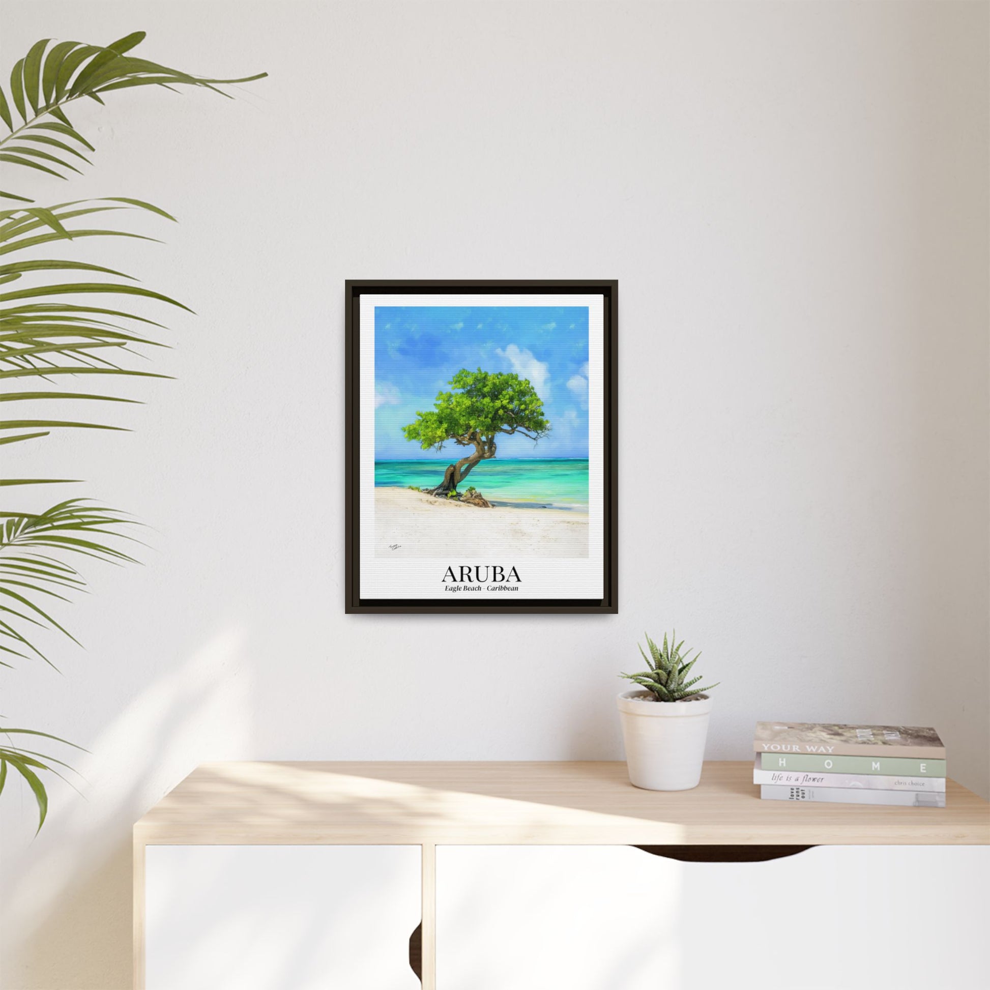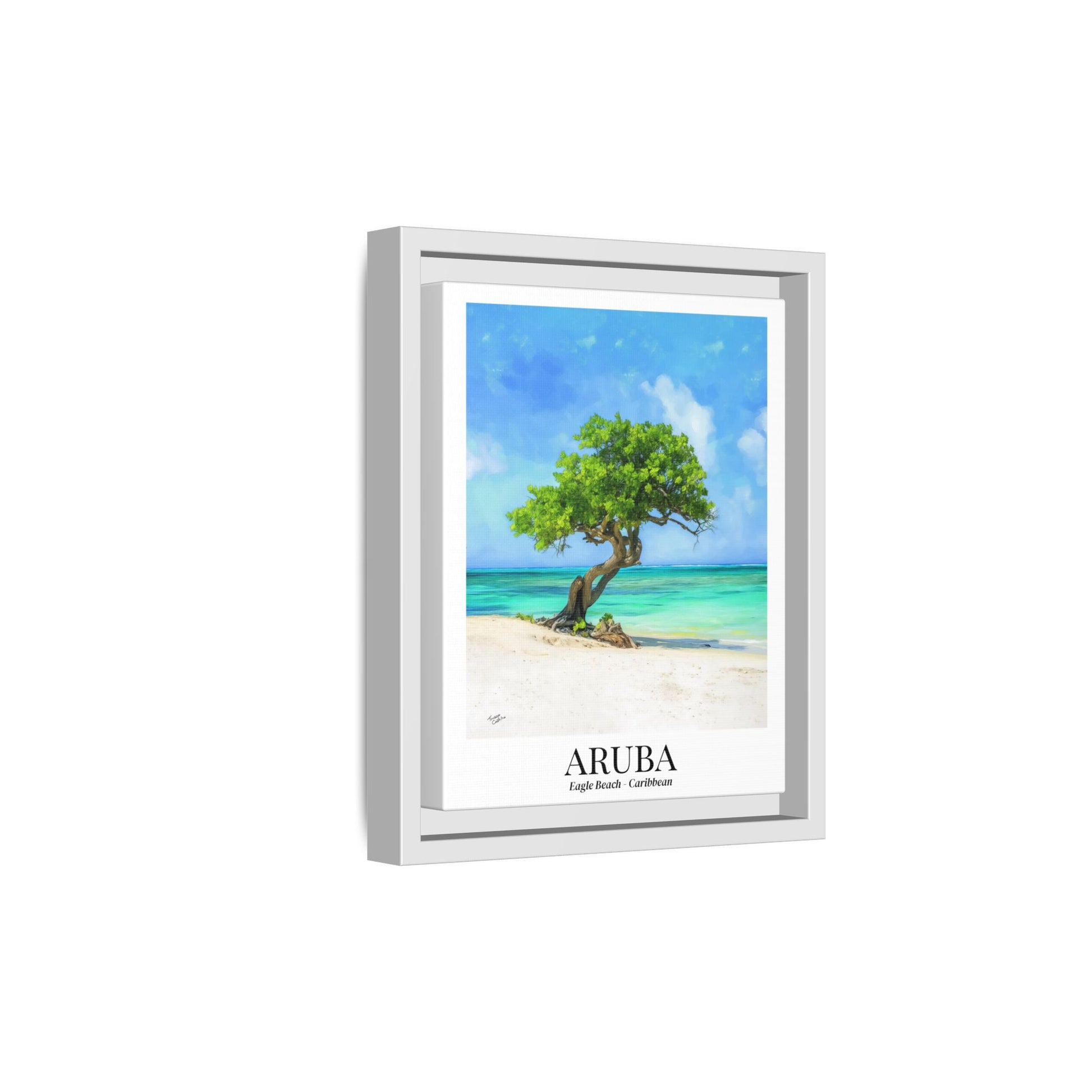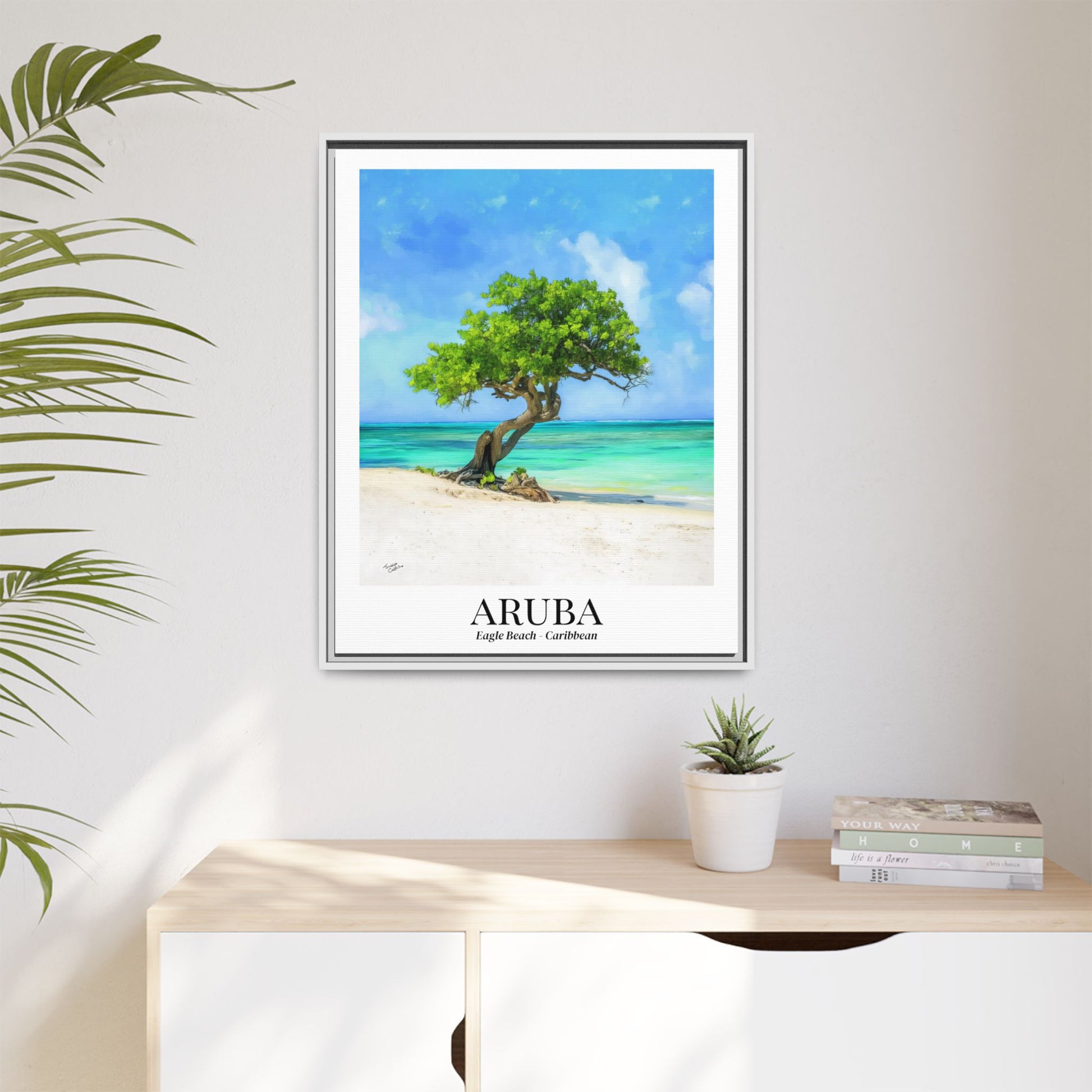 Aruba Framed Canvas Wall Art – Eagle Beach, Fofoti Tree Print, Cruise Ship Vacation Memory, Caribbean Decor, Beach House Gift for Travelers