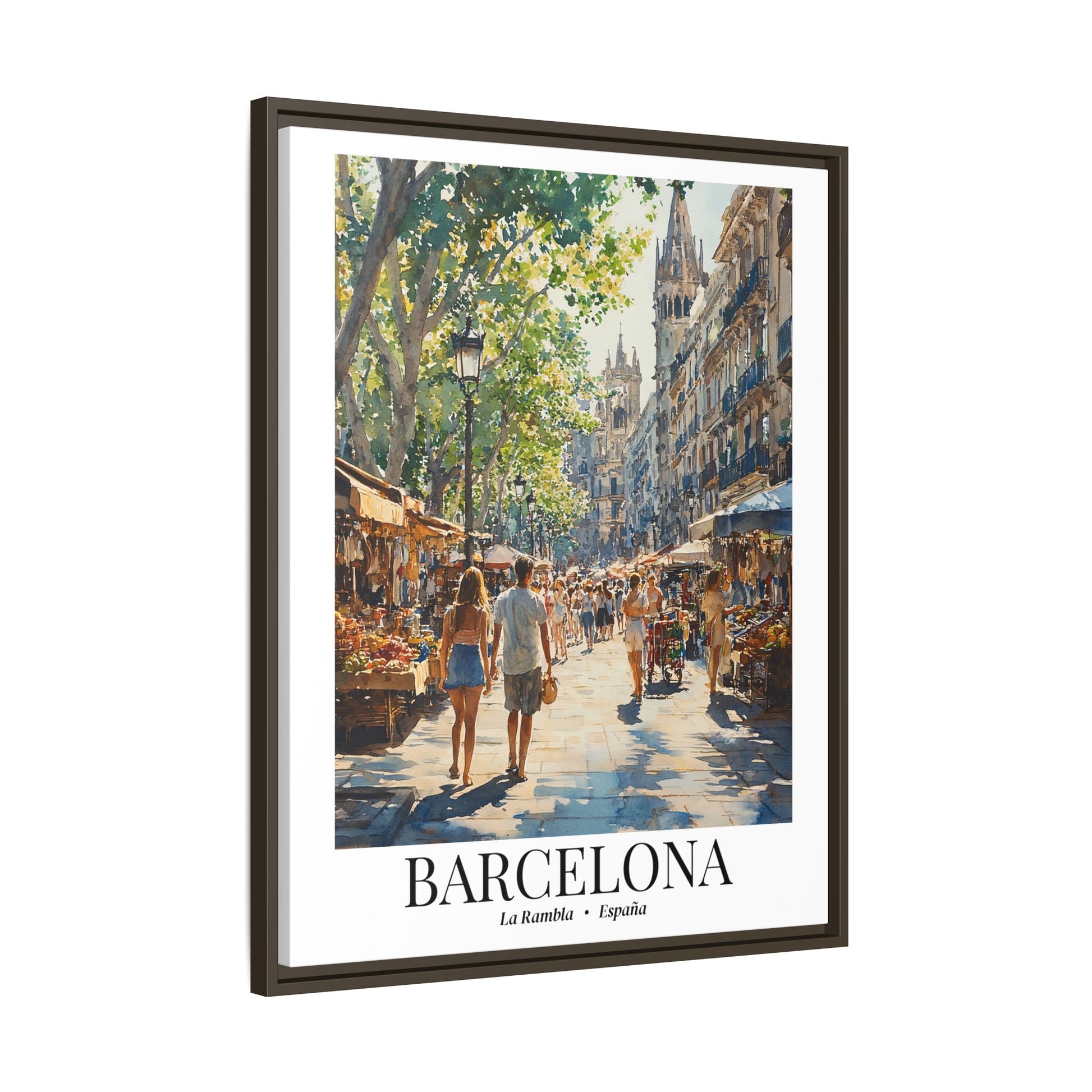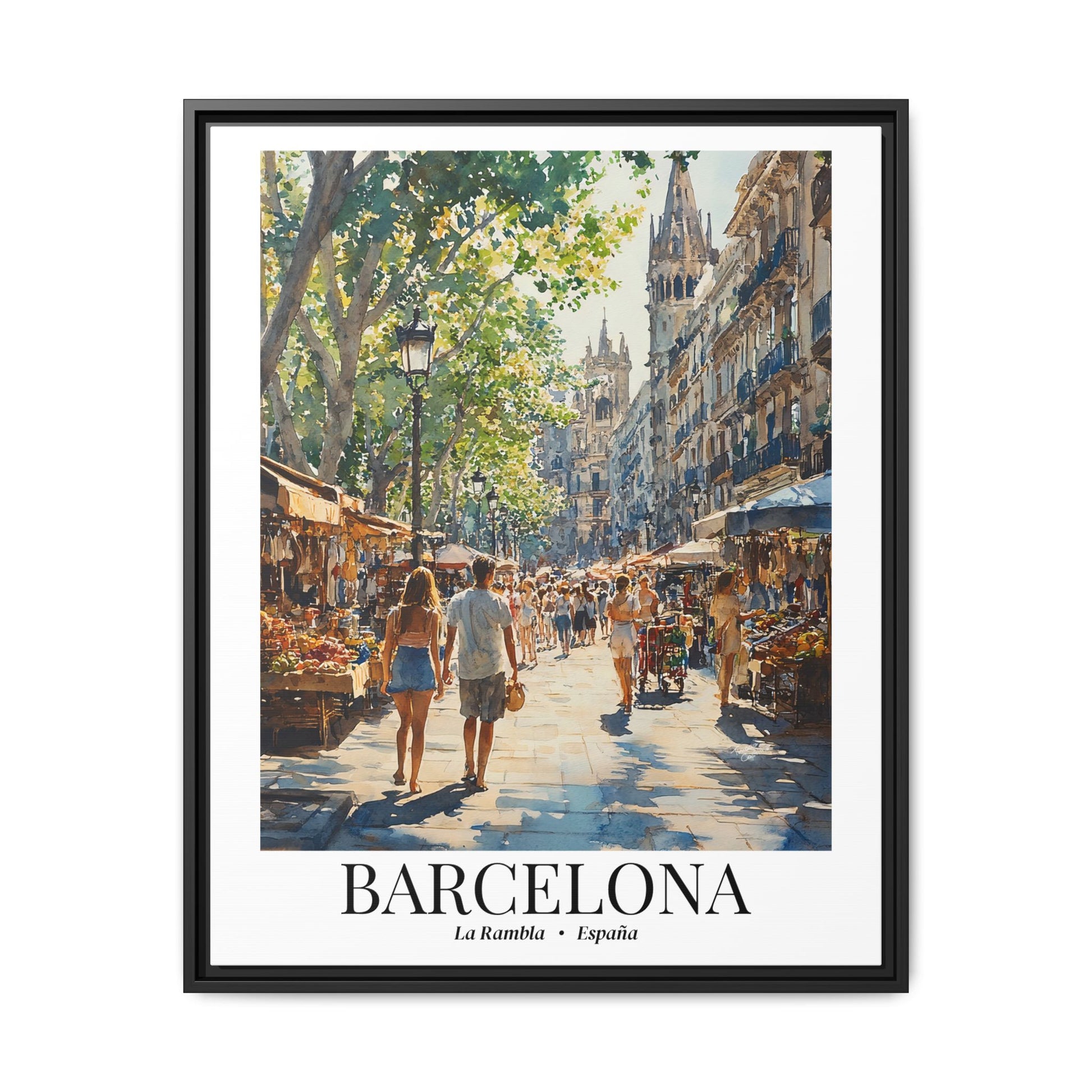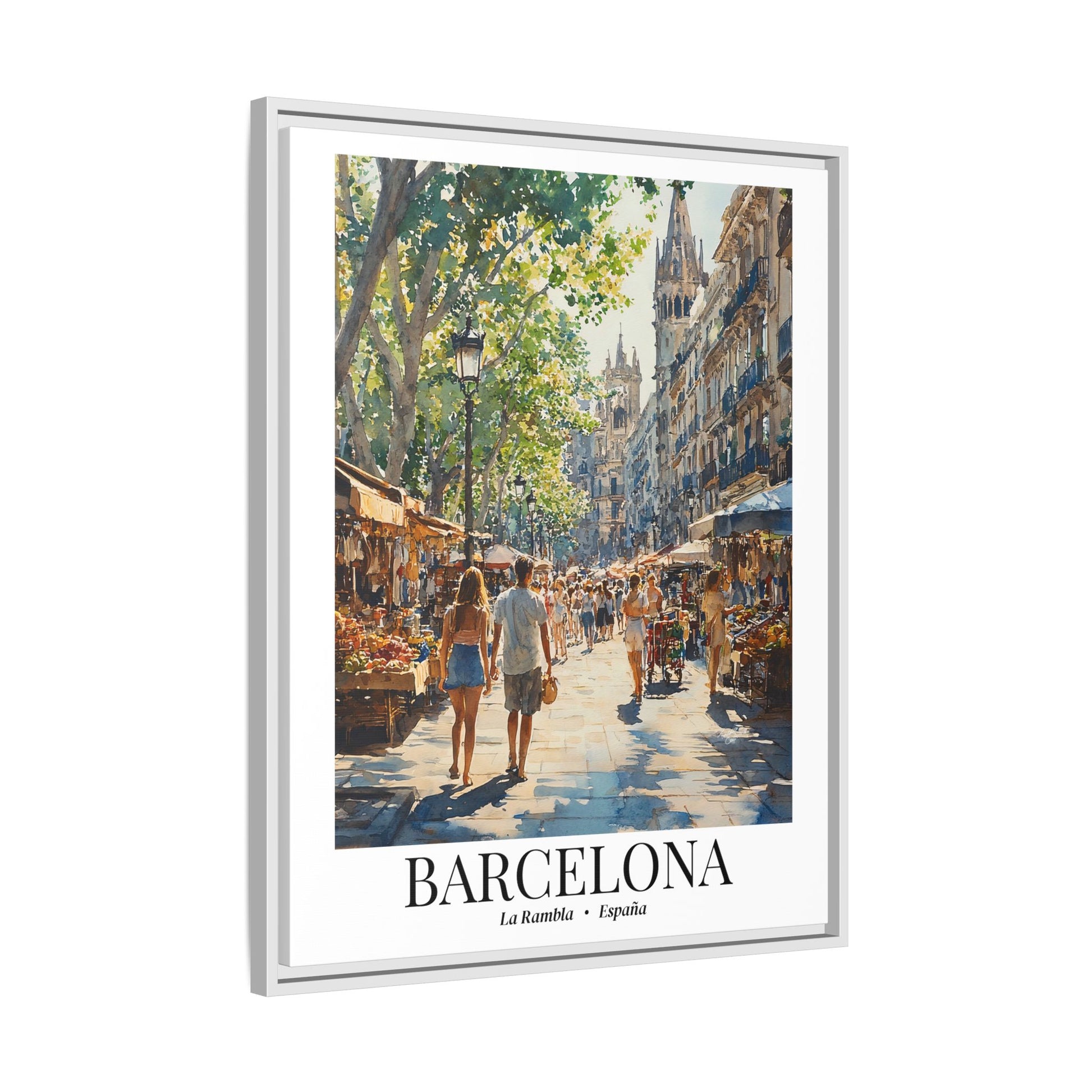 Barcelona Framed Canvas Wall Art – La Rambla Street Scene Print, Cruise Port Memory, Spain Travel Decor, Mediterranean Gift for City Lovers