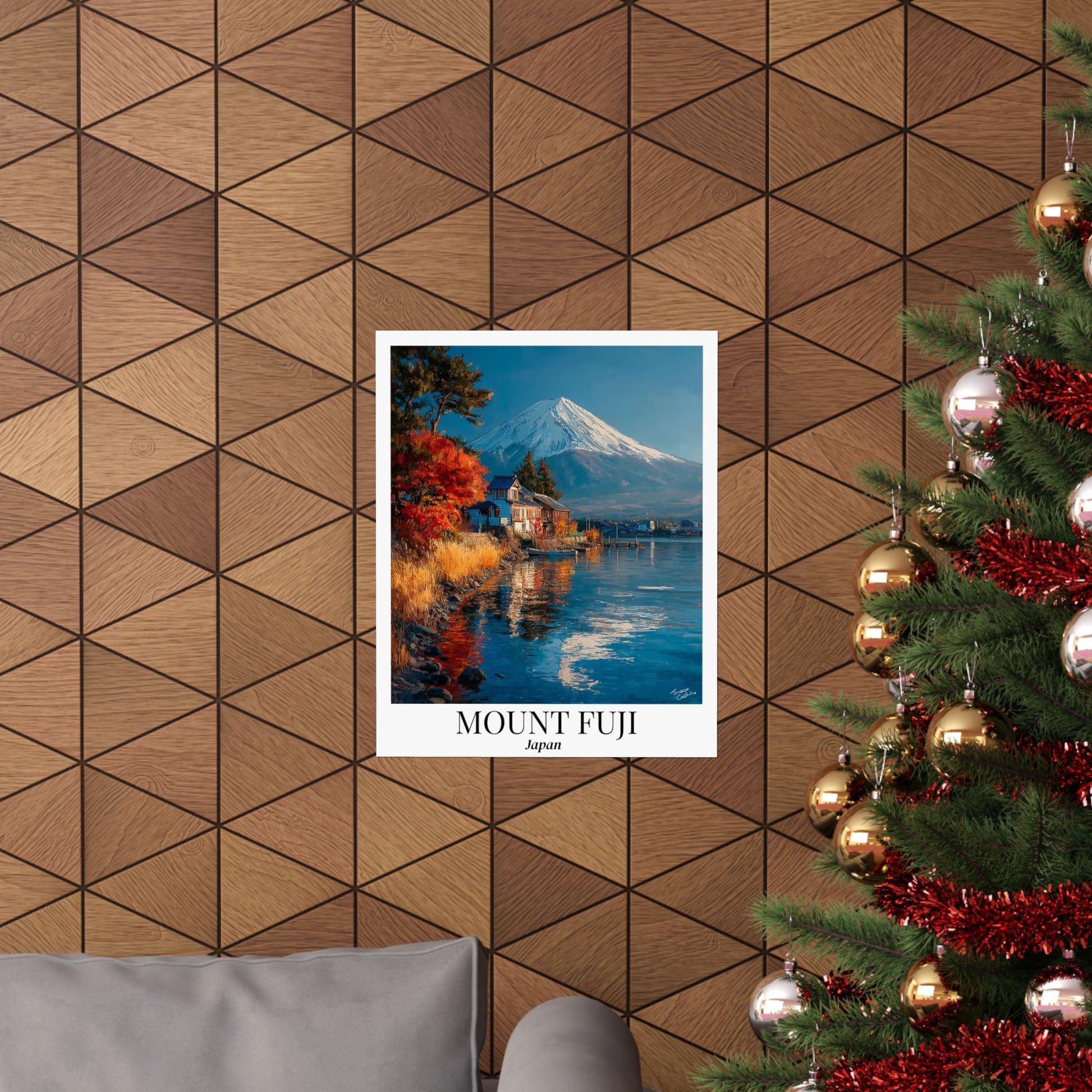 This artwork reflects Mount Fuji as it’s experienced beyond the summit. Early mornings with fishermen along the lakes, travelers stopping to take photos as the mountain reveals itself between clouds, locals passing through villages where Fuji is always in view. The scene feels calm and structured, shaped by water, land, and movement rather than spectacle.