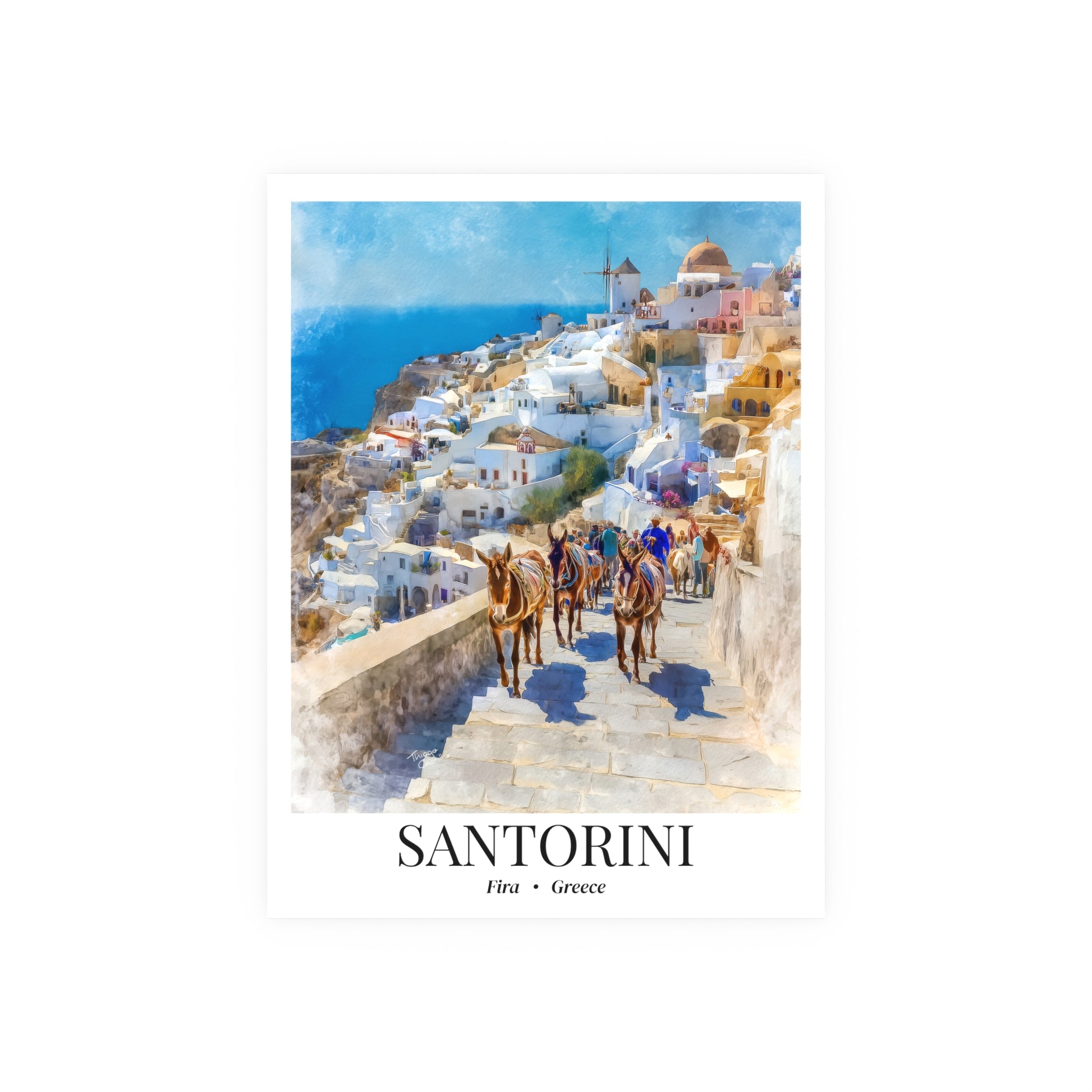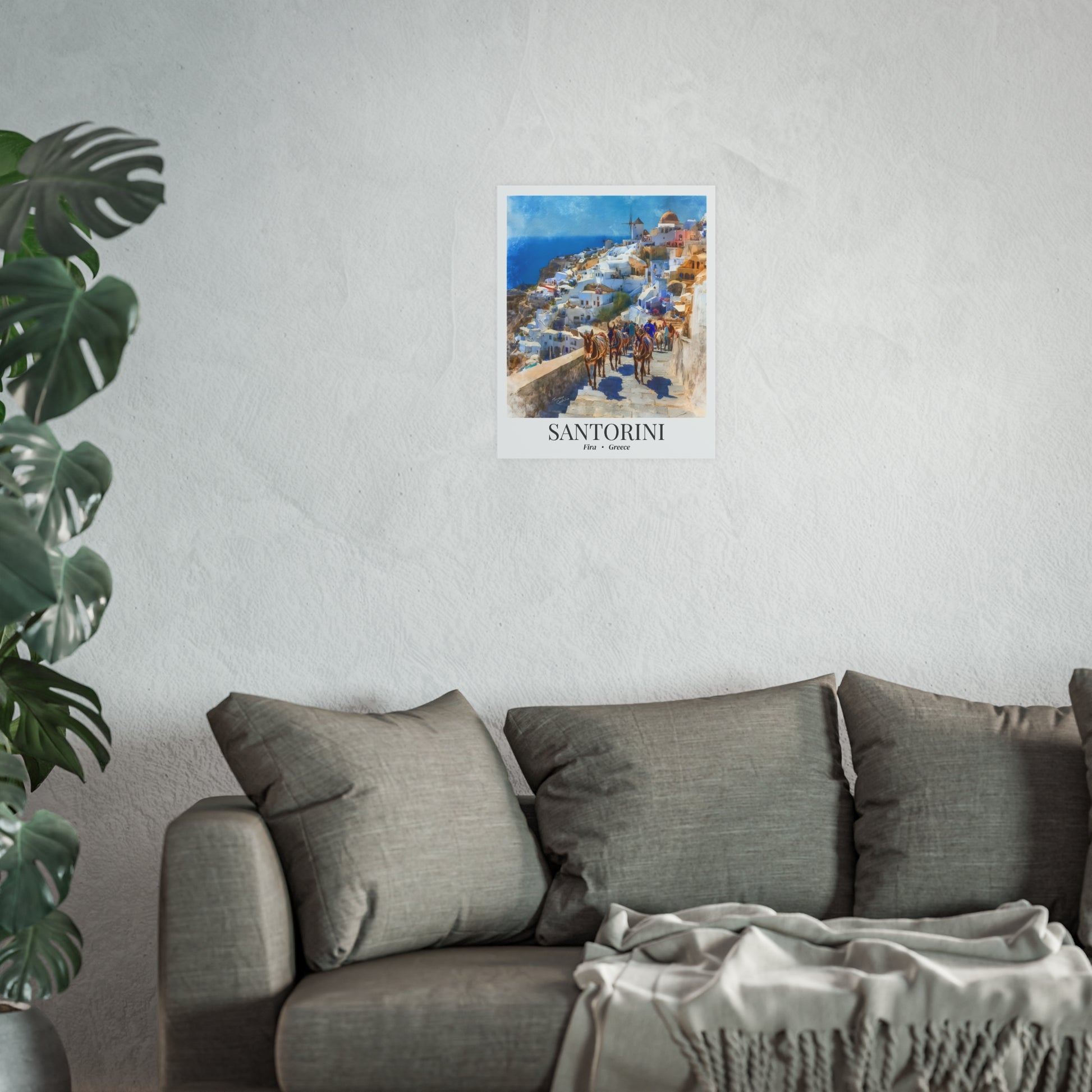Santorini Travel Poster – Fine Art Print, Donkeys of Fira Artwork, Shared Memory Wall Decor, Greece Souvenir