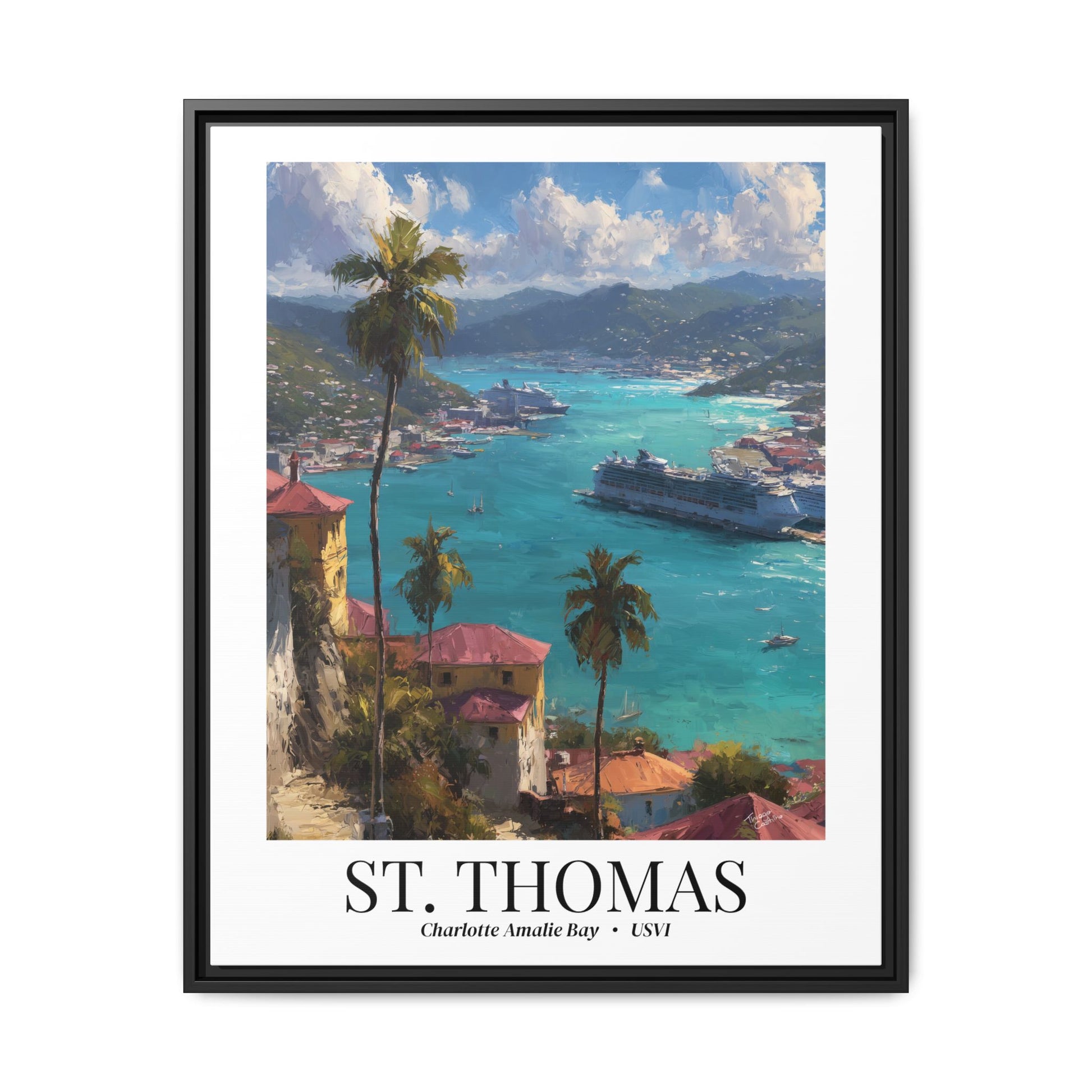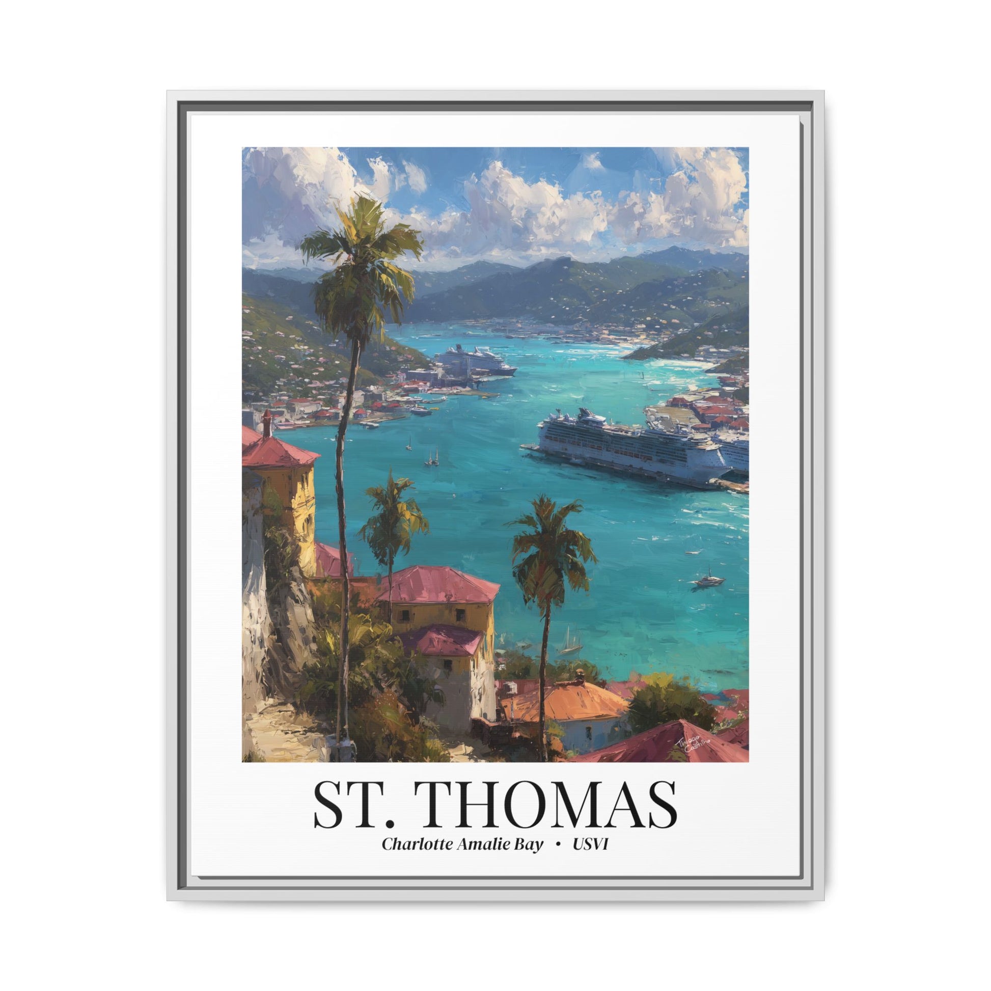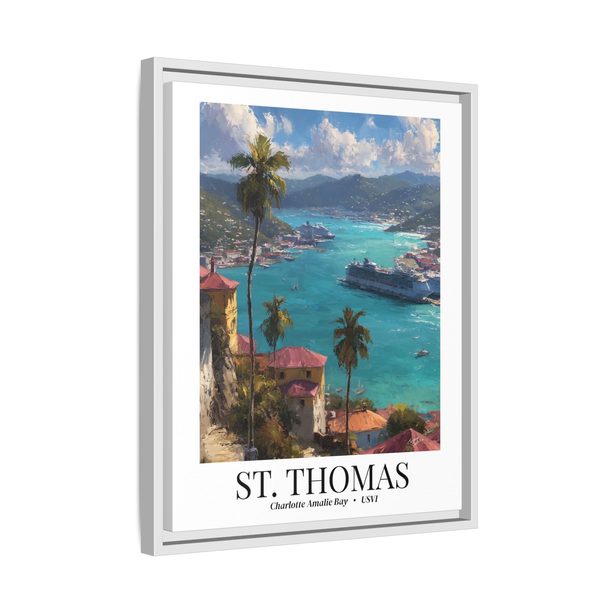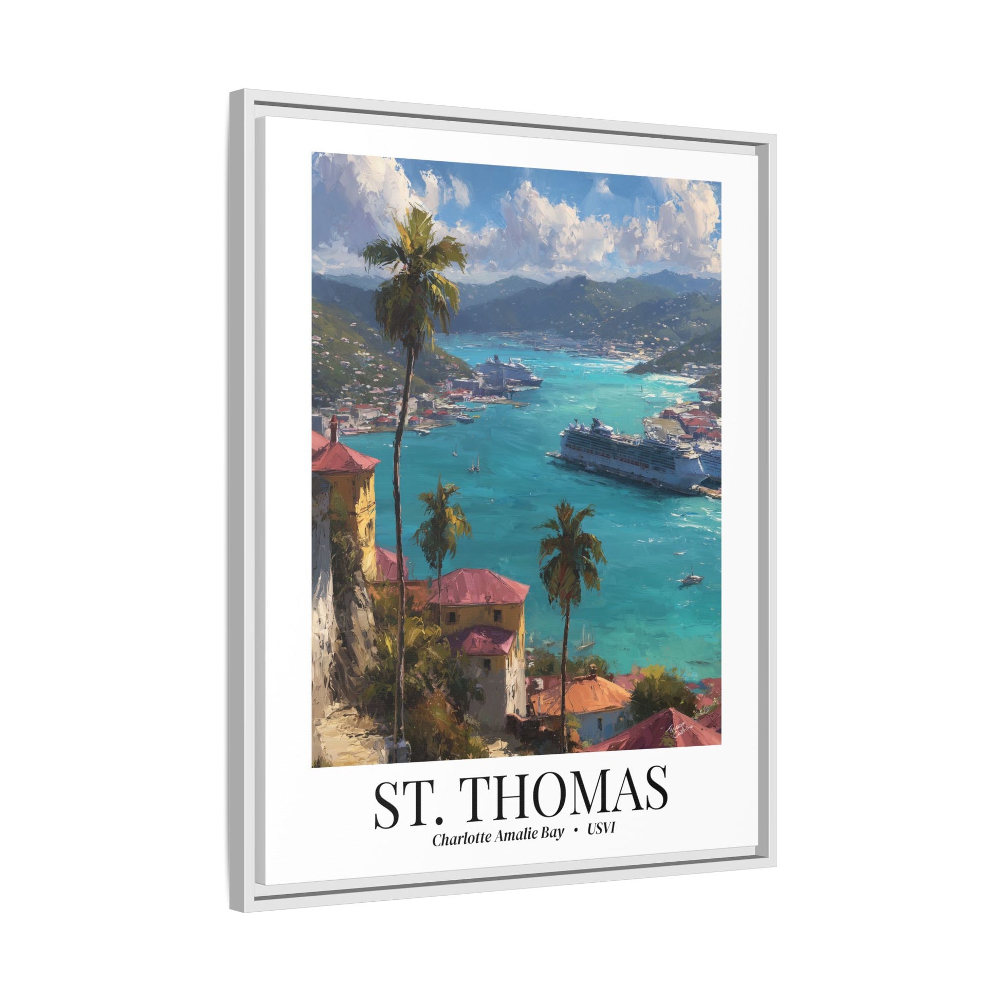 Bring the magic of St. Thomas into your home with this luminous fine art canvas, featuring the sweeping view of Charlotte Amalie Bay, where cruise ships rest against turquoise seas and palm-framed hills.